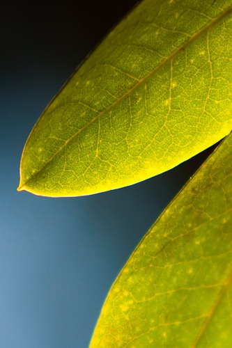 I saw these backlit leaves and liked the glow. I didn't have a macro lens or extension tubes with me, so I shot a much broader scene with a lot more leaves. I cropped it down to these two, mostly the get the shape against the lovely background. Besides cropping the image, I only messed with the levels to do this.