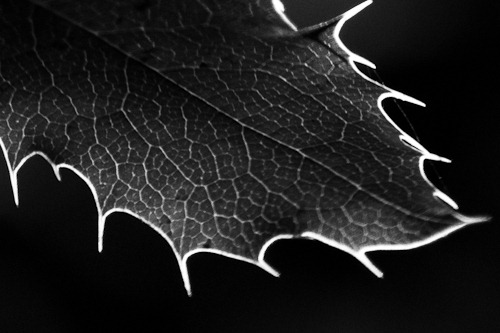 Art turned me onto this kind of pointy, backlit leaf. The leaves themselves were green with brown spots, which I thought was distracting. I loved how the edges and veins glowed, so I decided to focus on those and minimize the color distractions by going black and white. I haven't decided yet whether I like this image better this way or vertically.