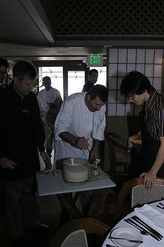 Chef shows Wayne how to plate and dress the salad spring rolls.